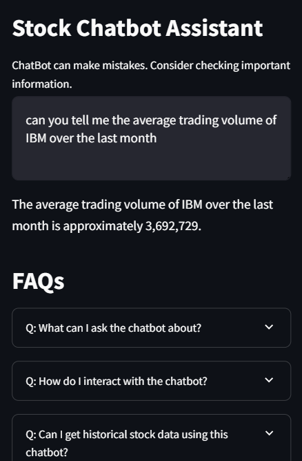 The Stock ChatBot Assistant, built with Python, OpenAI API, and Streamlit, offers an interactive platform for insights on stocks, technical indicators, stock comparisons, and recent news.